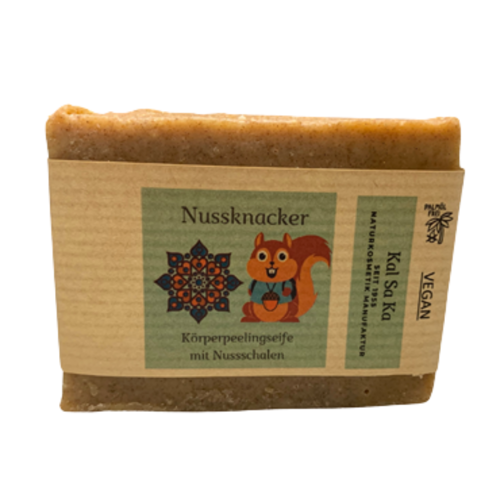 Sanfte Körperpeelingseife mit Nussschalengranulat.